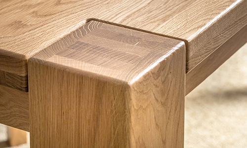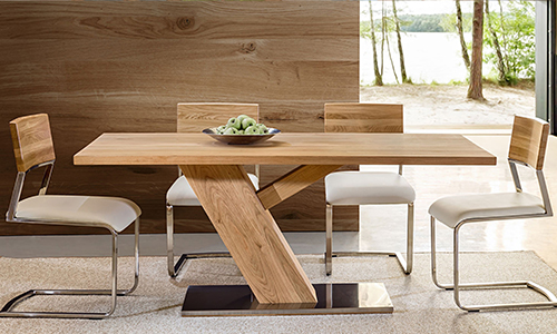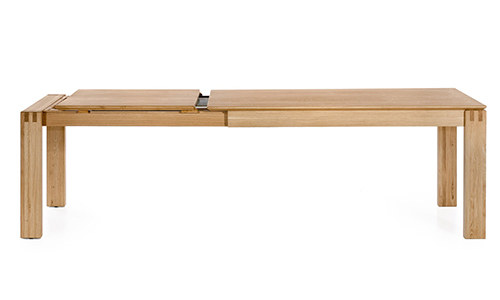 Das ganz spezielle Design, der abgeschrägten Tischkante zu den Tischfüßen macht diesen Tisch, neben seiner leichtlaufenden ausziehbaren Tischplatte aus.